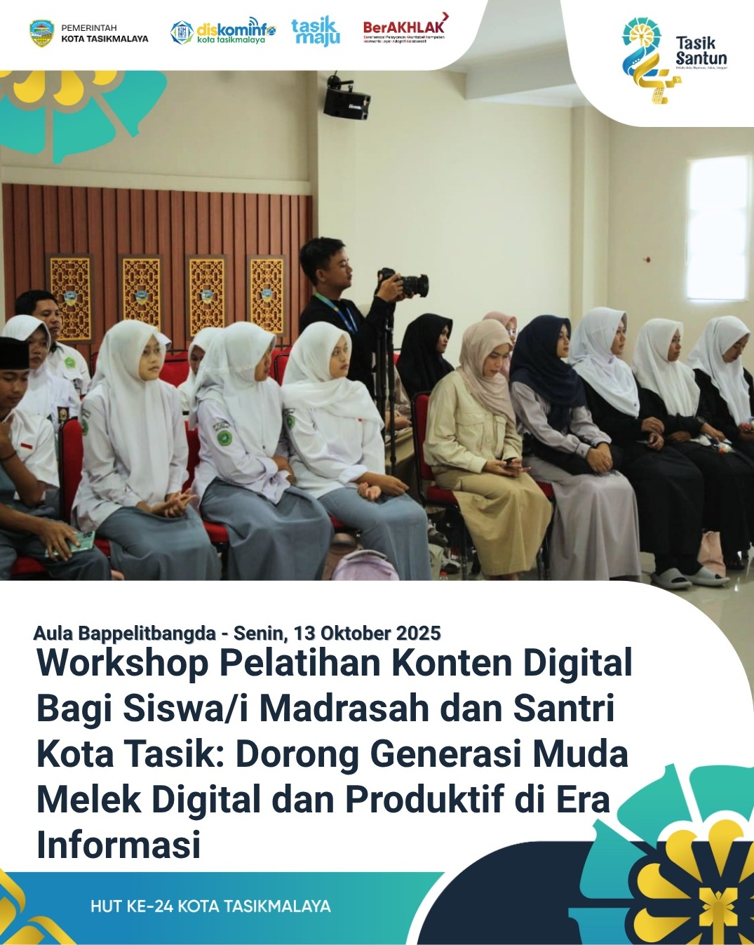 Tasikmalaya – Senin, 13 Oktober 2025. Dalam rangka menyambut Perayaan Hari Santri Tahun 2025 dan Menyambut Hari Jadi Ke-24 Kota Tasikmalaya, Pemerintah Kota Tasikmalaya melalui Dinas Komunikasi dan Informatika menyelenggarakan kegiatan “Workshop Pelatihan Konten Digital bagi Siswa/i Madrasah dan Santri Kota Tasikmalaya”.