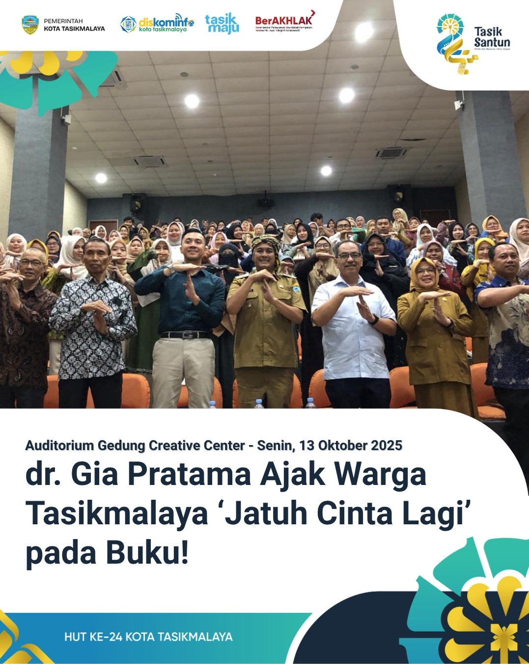 Tasikmalaya – Senin, 13 Oktober 2025. Dalam rangka memeriahkan Hari Jadi ke-24 Kota Tasikmalaya, Dinas Perpustakaan dan Kearsipan Daerah (Dipusipda) Kota Tasikmalaya menggelar kegiatan “Bedah Buku Koleksi Perpustakaan Daerah bersama dr. Gia Pratama” di Auditorium Gedung Creative Center (GCC) Kota Tasikmalaya.