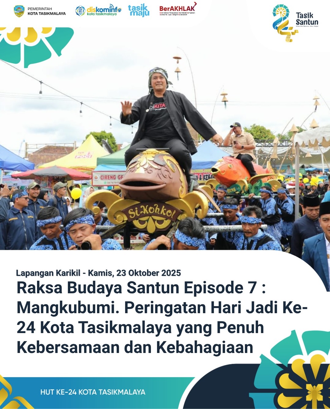 Sebagai informasi, “Raksa Budaya Santun” merupakan program spesial yang hadir secara merata selama satu bulan di 10 kecamatan di Kota Tasikmalaya. Kehadiran program ini di setiap kecamatan menunjukkan komitmen Pemerintah Kota Tasikmalaya untuk melibatkan masyarakat dalam perayaan hari jadi Kota Tasikmalaya ke-24 Tahun ini.