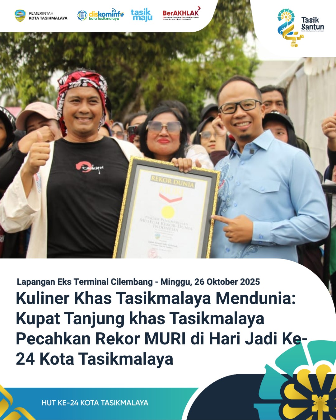 Tasikmalaya – Minggu, 26 Oktober 2025, ribuan warga Tasik turut serta dalam Perayaan Hari Jadi ke-24 Kota Tasikmalaya di Lapangan Eks Terminal Cilembang. Kuliner khas Tasik diangkat ke panggung nasional melalui pemecahan rekor yang spektakuler yaitu sebanyak 2.417 porsi Kupat Tanjung Terbanyak dan disertai Festival Bakso Tasik sebanyak 6.000 porsi yang dibagikan secara gratis untuk warga Kota Tasikmalaya.