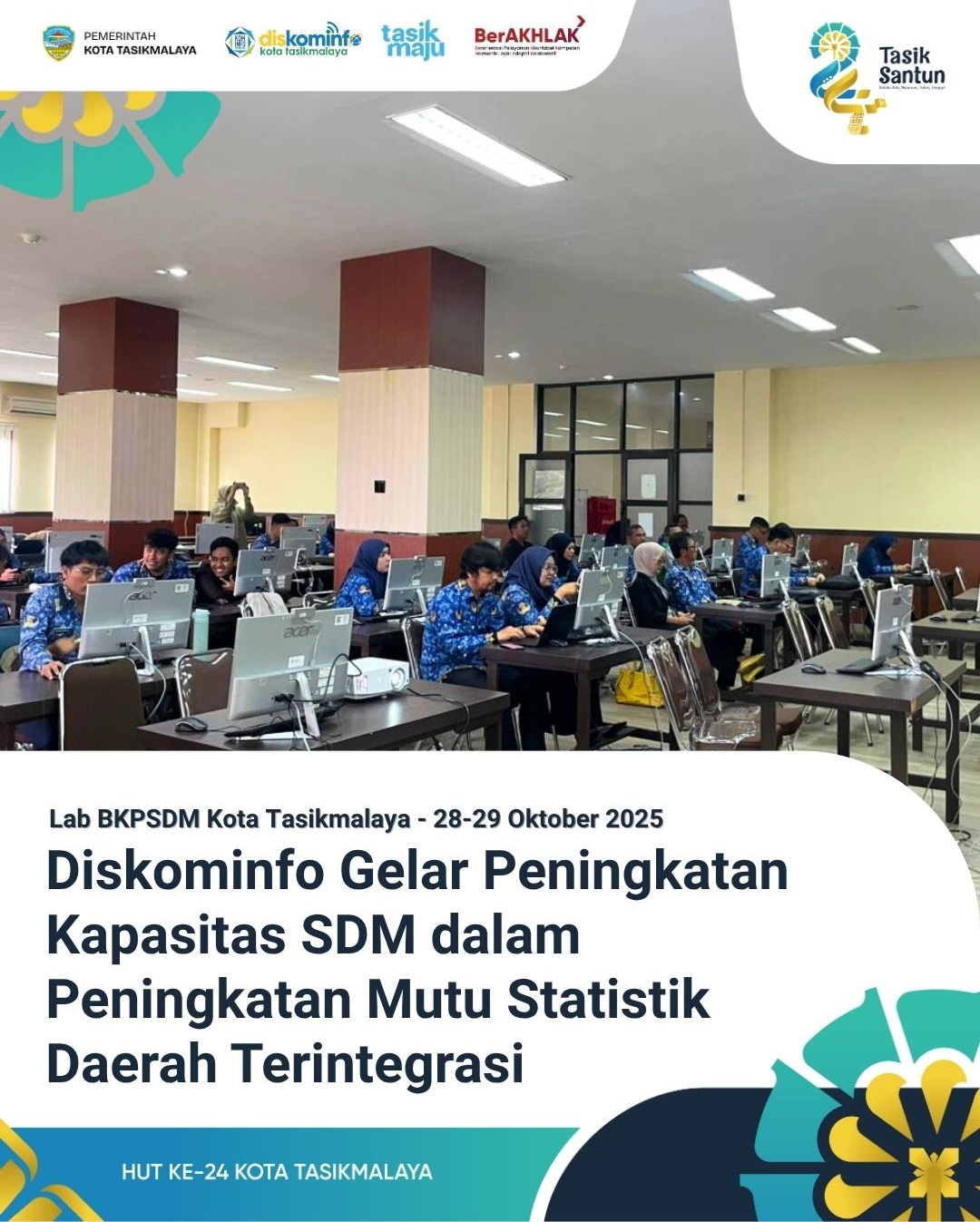 Tasikmalaya, 28 Oktober 2025 – Dinas Komunikasi dan Informatika (Diskominfo) Kota Tasikmalaya menyelenggarakan kegiatan Peningkatan Kapasitas SDM Pemerintah Kota Tasikmalaya dalam Peningkatan Mutu Statistik Daerah yang Terintegrasi. Kegiatan ini diselenggarakan selama 2 hari berturut-turut dari tanggal 28-29 Oktober 2025 yang bertujuan untuk memperkuat kemampuan aparatur pemerintah daerah dalam mengelola data statistik sektoral secara terpadu, akurat, dan dapat dipertanggungjawabkan.