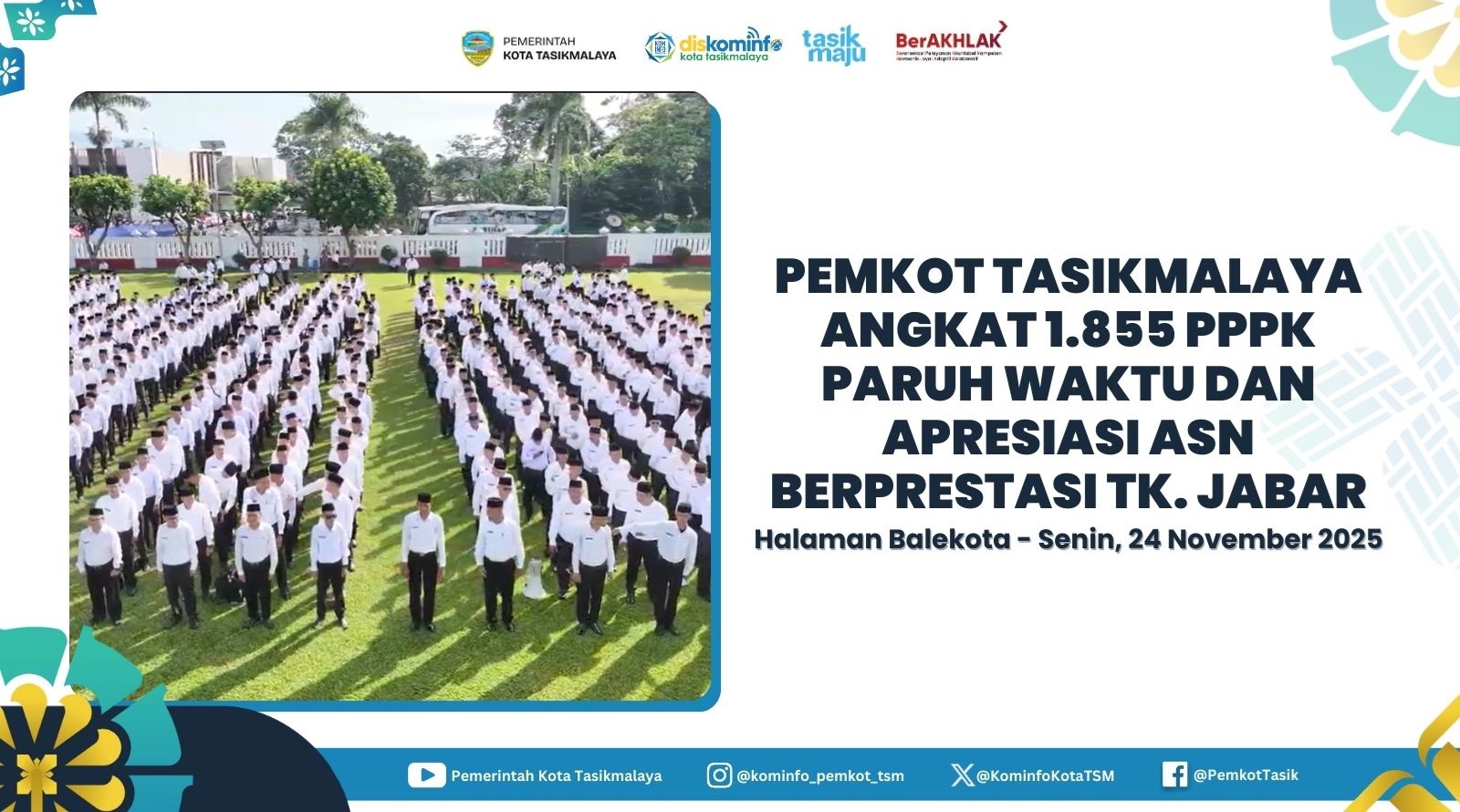 Tasikmalaya, 24 November 2025 — Pemerintah Kota Tasikmalaya menyelenggarakan acara Pengangkatan PPPK Paruh Waktu serta Penyerahan Penghargaan PNS Berprestasi Tingkat Provinsi Jawa Barat bertempat di Bale Kota Tasikmalaya, Jumat (24/11/2025). Acara dipimpin langsung oleh Wali Kota Tasikmalaya, Viman Alfarizi, S.T., M.BA.