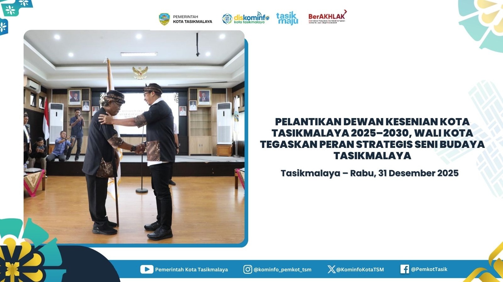 Tasikmalaya – Rabu, 31 Desember 2025, Wali Kota Tasikmalaya Viman Alfarizi Ramadhan, S.T., M.BA melantik Pengurus Dewan Kesenian Kota Tasikmalaya (DKKT) Masa Bakti 2025–2030 di Aula Bale Kota Tasikmalaya.